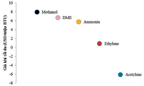 This article presents the results of evaluating and ranking gas processing projects based on economic effectiveness via aff ordable maximum natural gas price and the ratio of NPV/total investment cost. The research shows that it is most economically effective to produce methanol from natural gas, followed by dimethyl ether and ammonia. And the economic eff ectiveness of the project to produce olefi ns (ethylene and propylene) by MTO/MTP technology is better than that by ethane or propane steam cracking. The authors believed that the central region of Vietnam is a proper site to construct such projects in order to take advantage of the natural gas from the Ca Voi Xanh field which has high CO2 content. The estimated margin of these complexes ranges from $0.29 to $0.34 per cubic metre of natural gas, which is ten times higher than that of gas-based power generating projects.