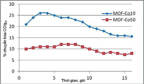 Metal-organic framework materials (MOF-Co10, MOF-Co50 and MOF-Co100) were synthesised by solvothermal method. The catalysts were characterised by XRD, TG/DSC, BET, FT-IR and SEM. The results show that MOF-Co10 has good thermal stability (up to 300oC), high surface area of 665,58m2/g, and high porosity. MOF-Co can be used as catalyst for the Fischer-Tropsch synthesis (FTS) and other catalytic reactions which are carried out at temperature less than 300oC. The results obtained from the FTS at 200oC, 10 atm in 16 hours prove that the catalytic activity of MOF-Co10 is better than that of MOF-Co50. The reaction products (analysed by GC-MS) are mainly hydrocarbons in gasoline fraction. This opens a trend to use MOF-Co10 as catalysts for gasoline production by FTS.